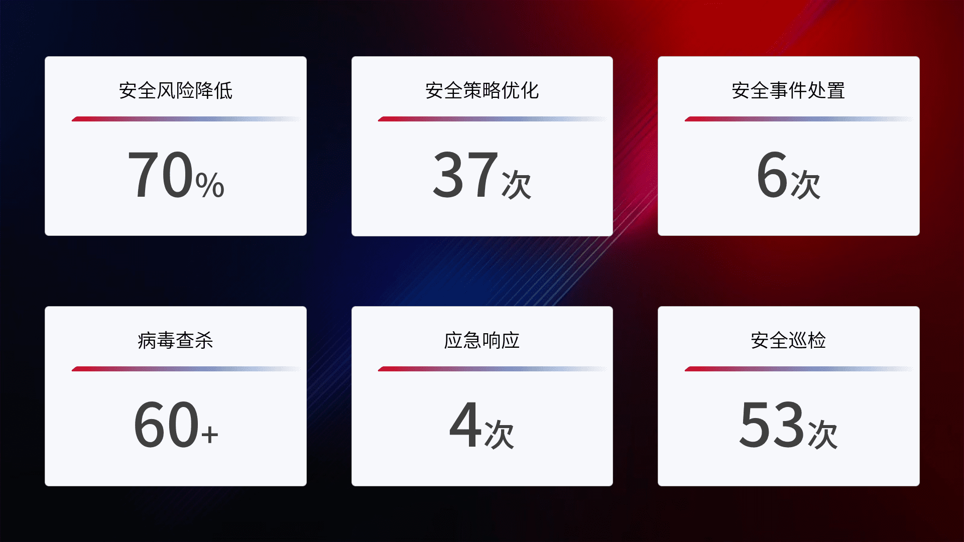 提供全面的安全事件报告体系,,,,包括处置报告、、、周报、、、、季度和年度总结,,,结合持续监控,,,,帮助客户深入了解网络安全状况。。
