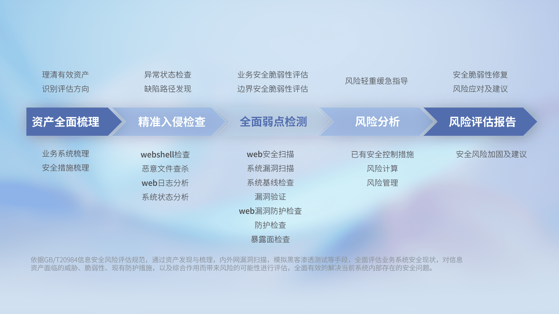 针对客户行业特性,,,以专业的安全服务+多厂商联合解决方案提供专属的一站式安全管理服务,,,帮助客户全面感知网络空间威胁,,,,基于识别、、、检测、、分析、、、防护、、、、监测、、、、响应的服务理论模型,,,,从方案咨询、、集成交付、、评估验证、、、、优化加固、、、、运维运营,,致力于为客户提供完整的闭环管理式安全服务。。以实战经验为客户打造高抵御风险的安全体系,,,,帮助客户发现威胁、、、、对抗威胁、、处置威胁,,不断积累安全对抗能力,,,持续保障数字化安全。。。。
